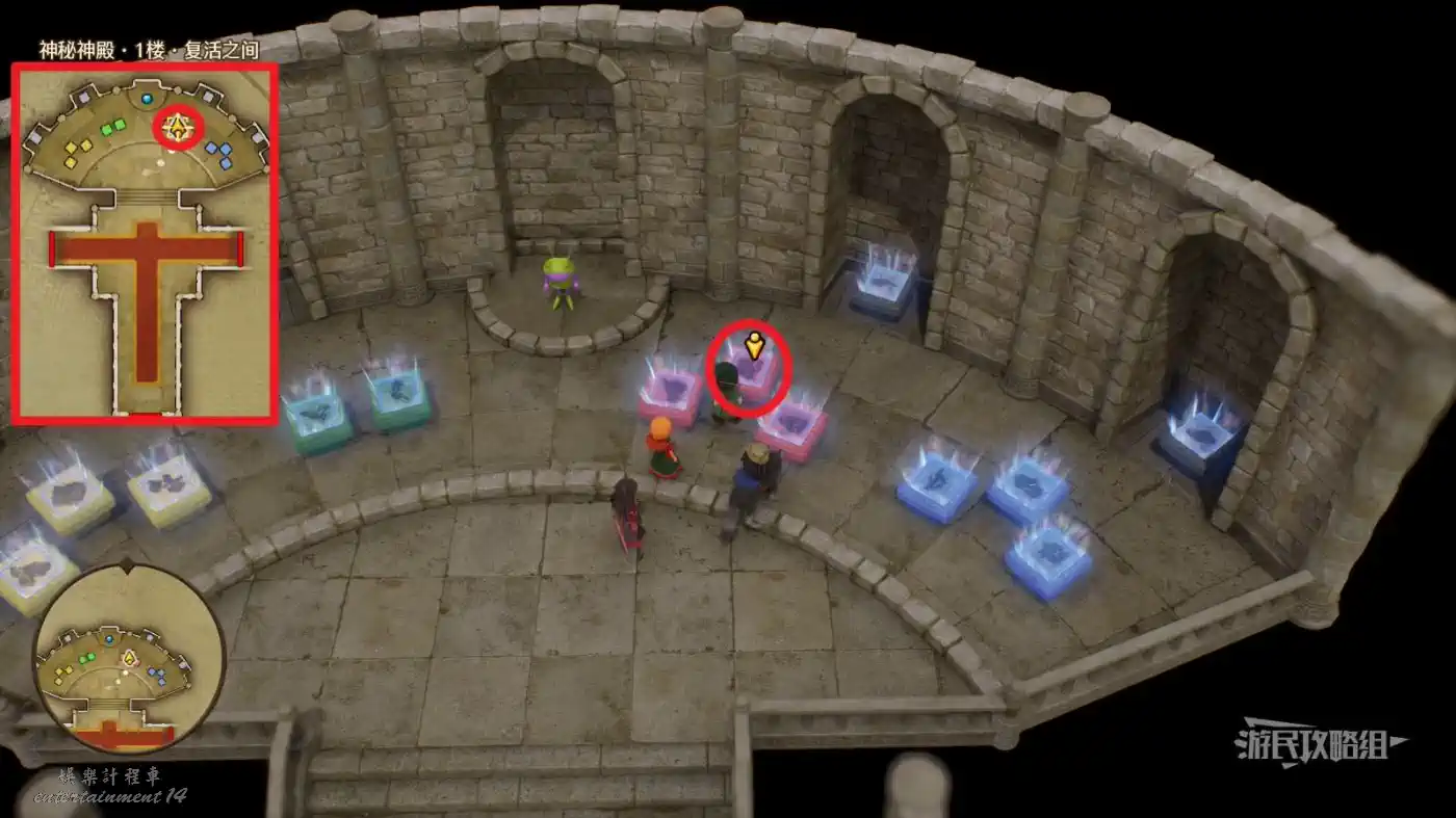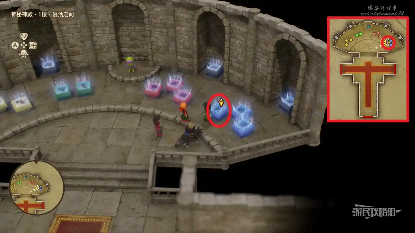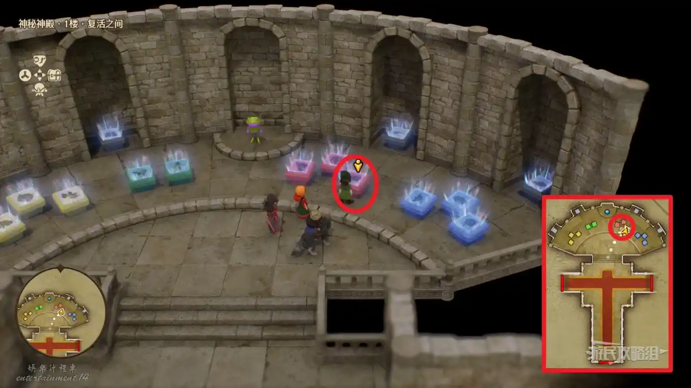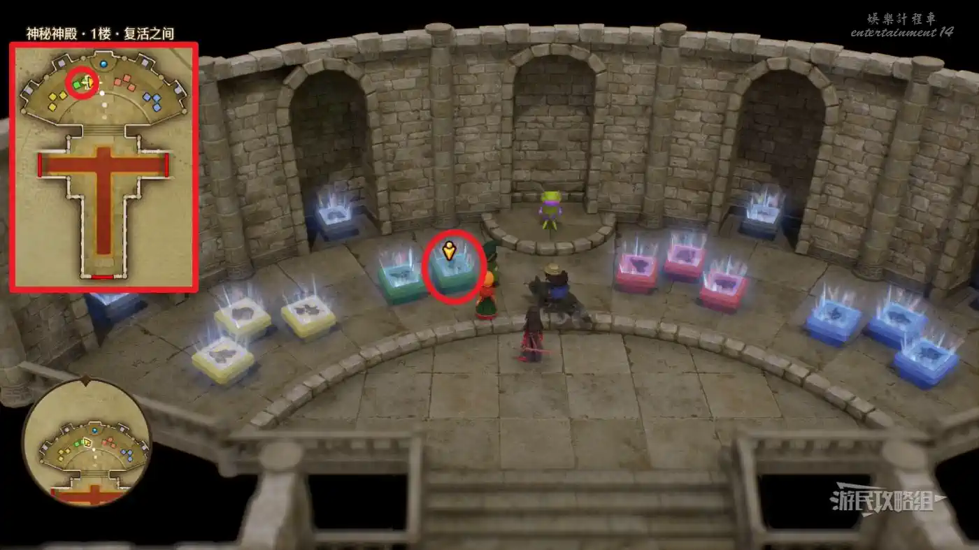 可解鎖【神秘神殿·1樓·復活之間】內最右側藍石板底座的中間底座【過去-達瑪周圍】區域。