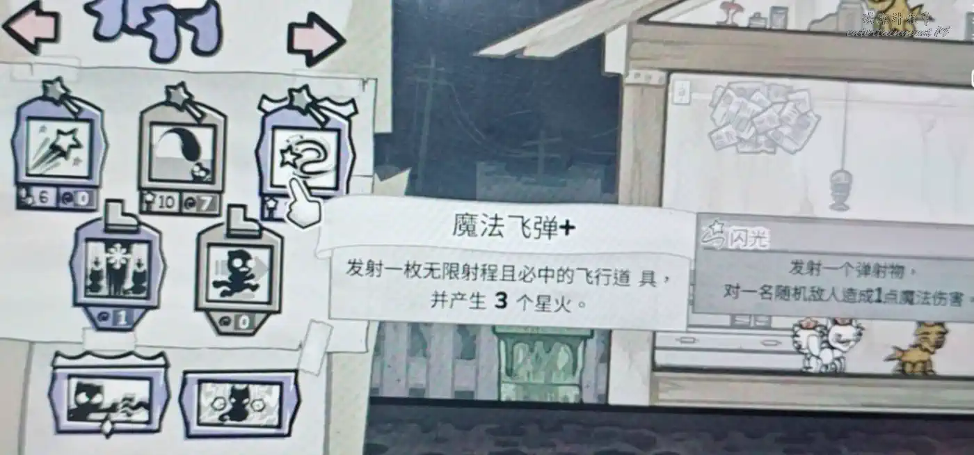魔法飛彈+閃光:發射一枚無限射程且必中的飛行道具,發射一個彈射物,並產生3個星火,對一名隨機敵人造成1點魔法傷害。