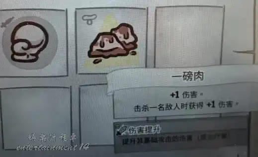 +1傷害,且擊殺一名敵人時獲得+1傷害加成。典型的滾雪球道具,殺得越多傷害越高。