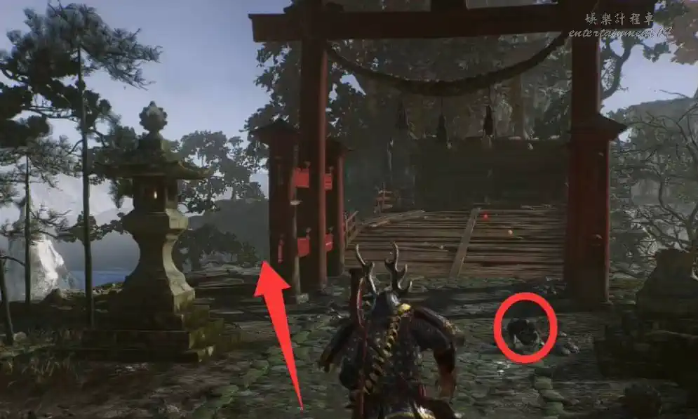 在神社內拾取迦具土的勾玉(任務道具),右側有寶箱,注意環境較暗。