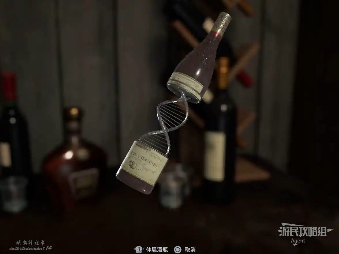 貴賓室裡有很多可以互動的物品,其中武器架旁桌上的酒瓶和解謎有關,旋轉酒瓶使葡萄圖案拼合起來,然後伸展酒瓶得到【雙螺旋模型】。把雙螺旋模型放到房間中間的檯子上,發現整個貴賓室其實是個電梯。