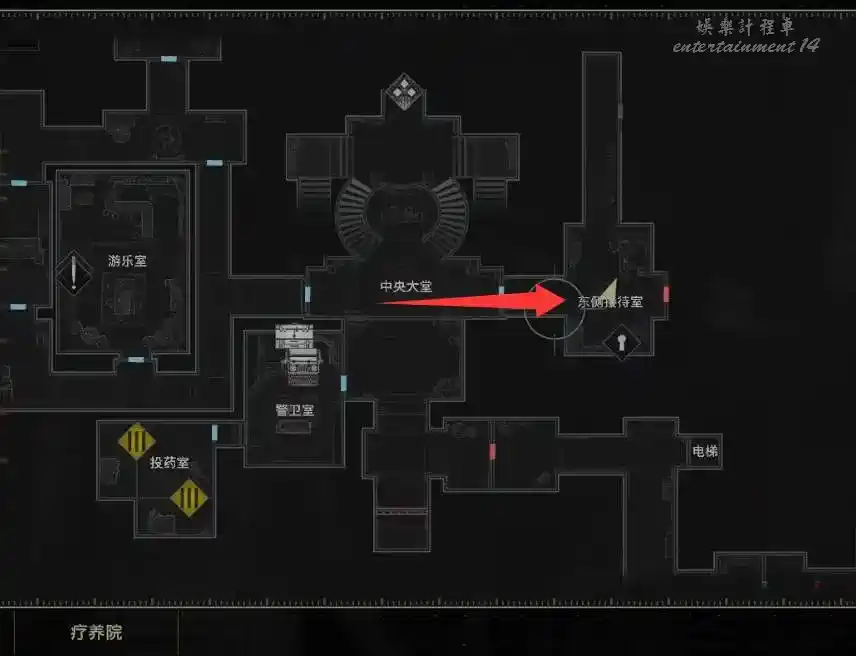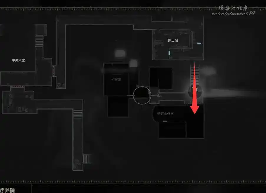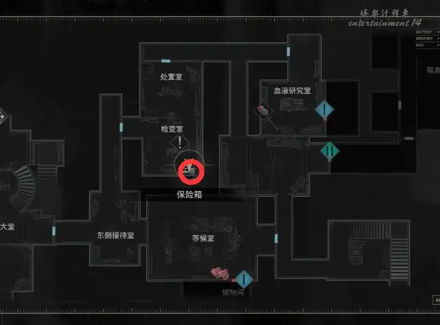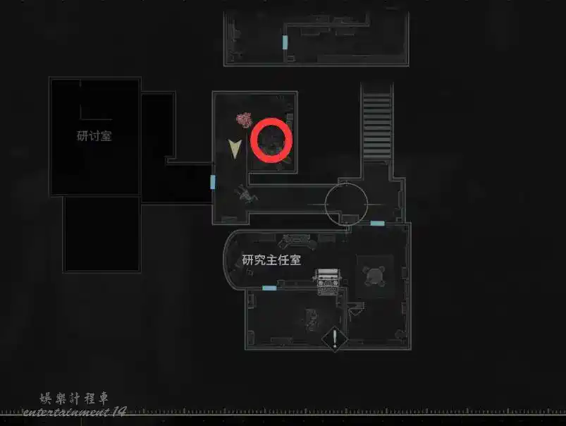 從等候室東面的樓梯上樓,拿到牆上的【東側地圖】,然後進入研究主任室有【撬鎖工具】和存檔點。