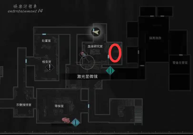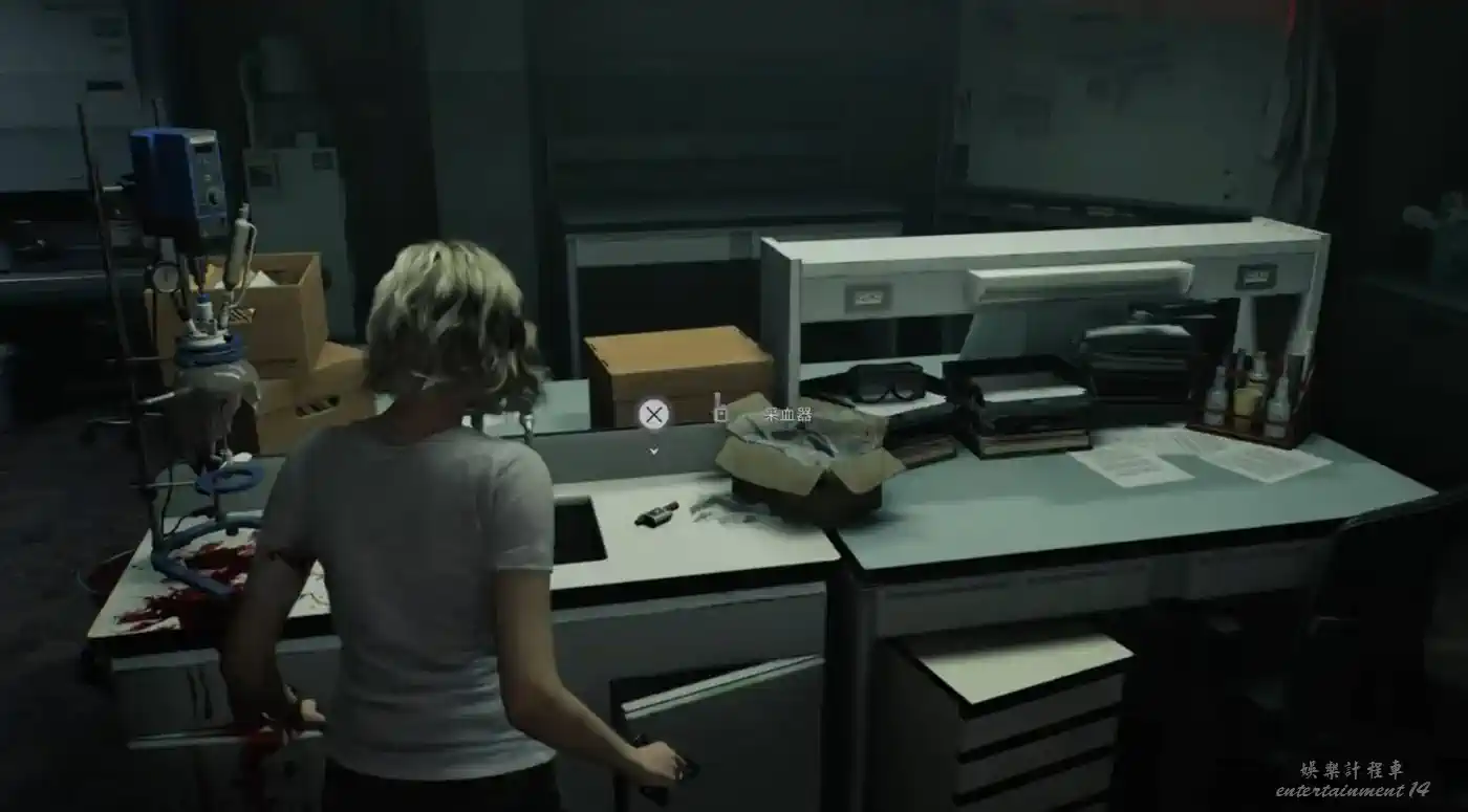 來到血液研究室,桌上拿到【采血器】,採集各處的感染血液可以用來合成物品。感染血液此時在地圖上已經全都自動標出來了,放心暫時不撿也不會消失,隨著探索進行慢慢的你就會把它們用完了。