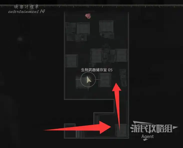 方舟地圖生化武器儲存室,這裡的集裝箱都可以打開搜刮,進門第一個集裝箱裡拿到【腰包】。地圖上方形的就是集裝箱。