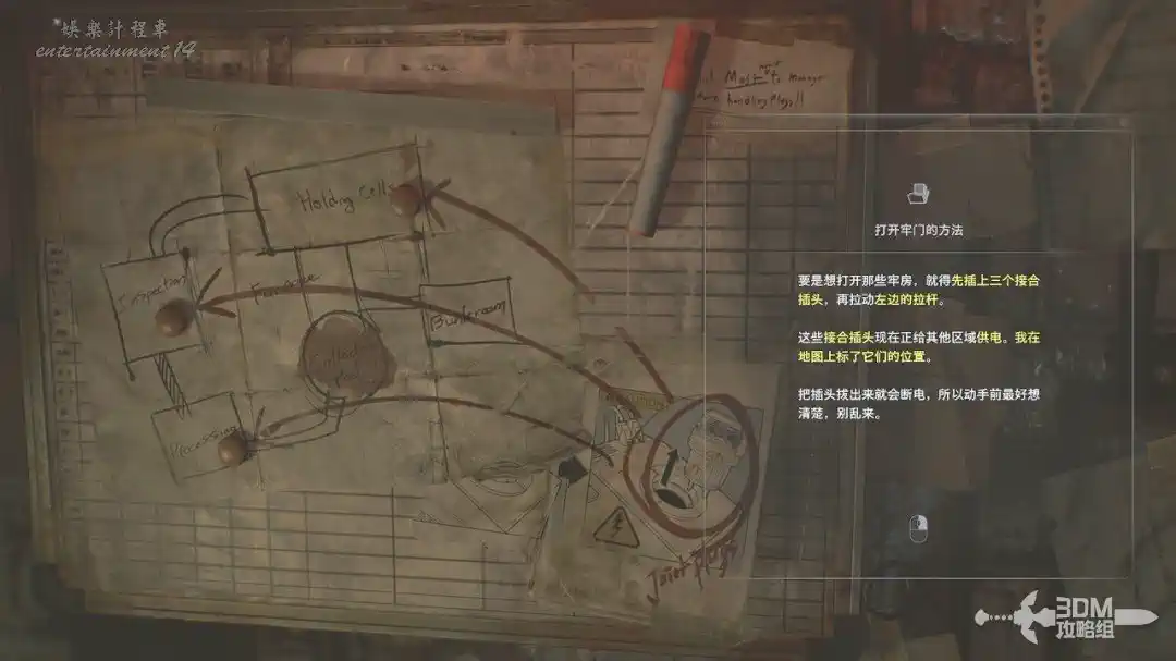 過來機器面前,先和牆上的說明書“打開牢門的方法”互動。我們現在需要湊齊三個插頭給這裡發電。