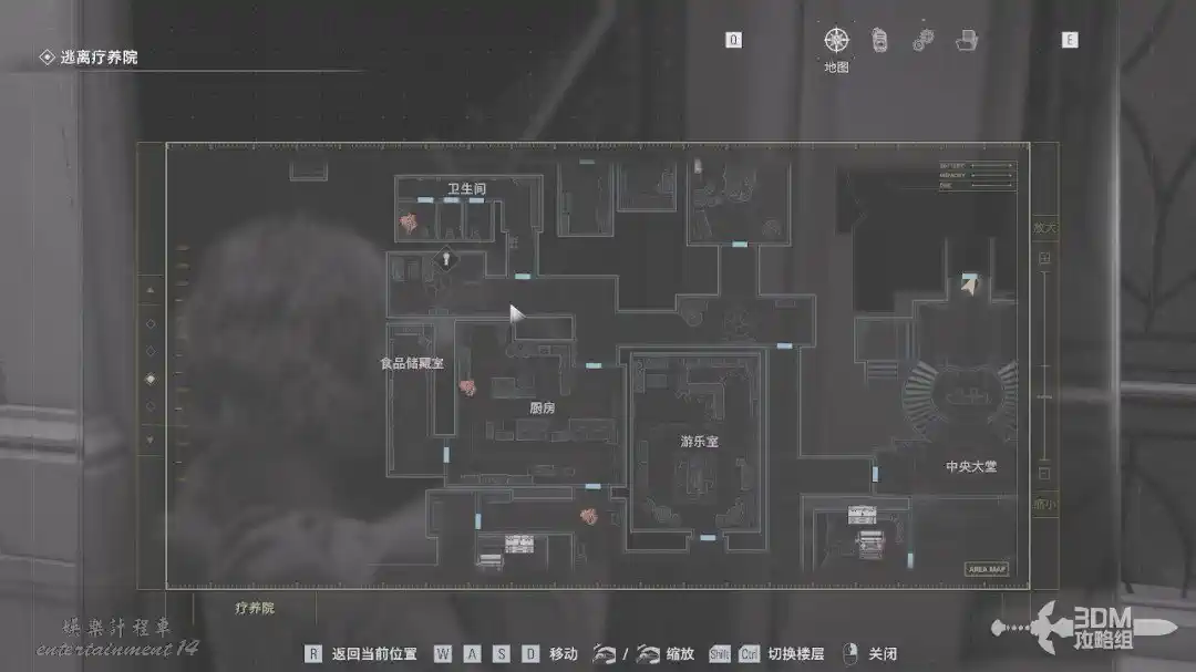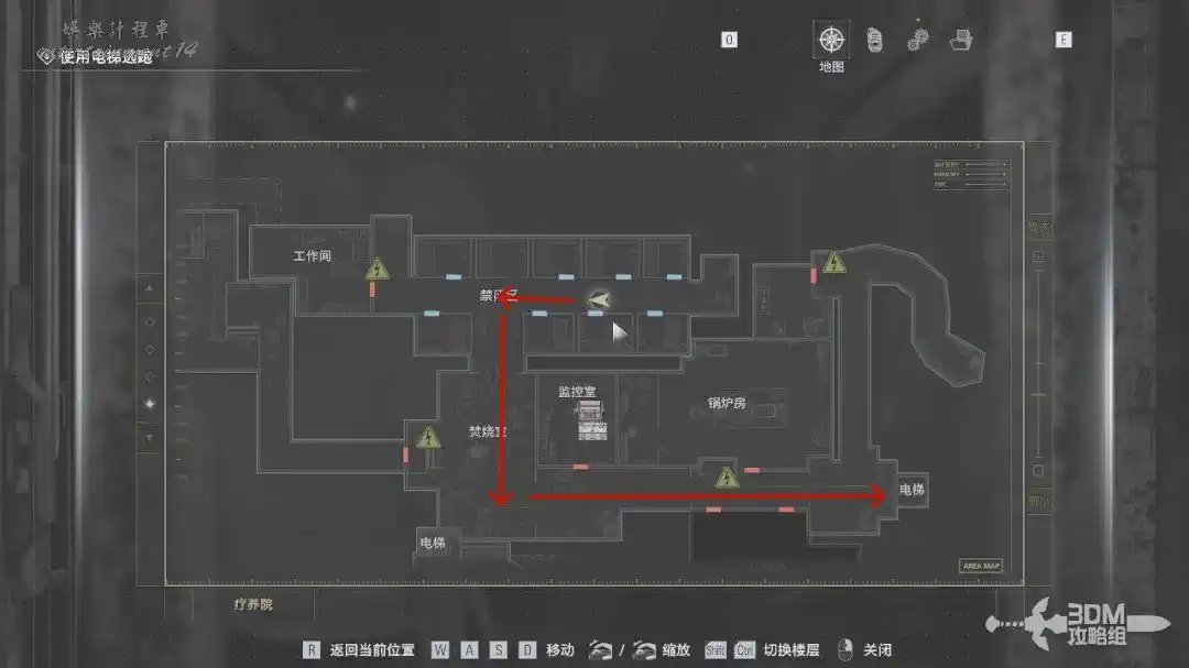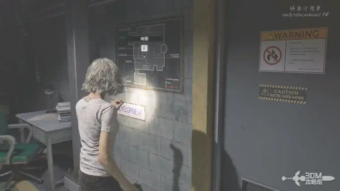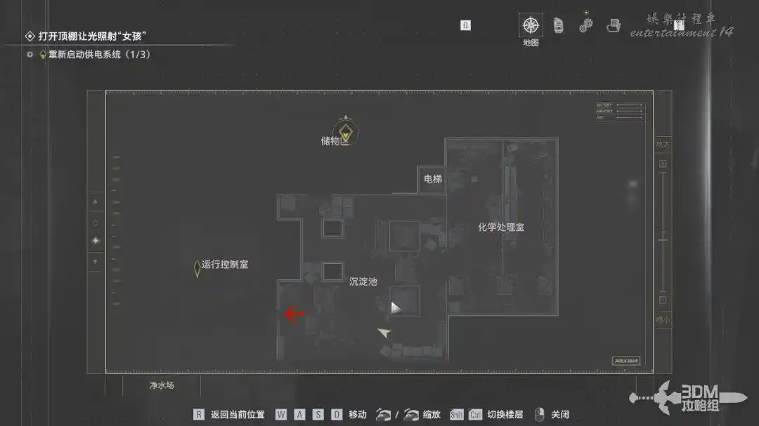 此時系統會讓我們打開地圖查看供電系統的位置。不要往後面的樓梯走,往前面紅色箭頭走。