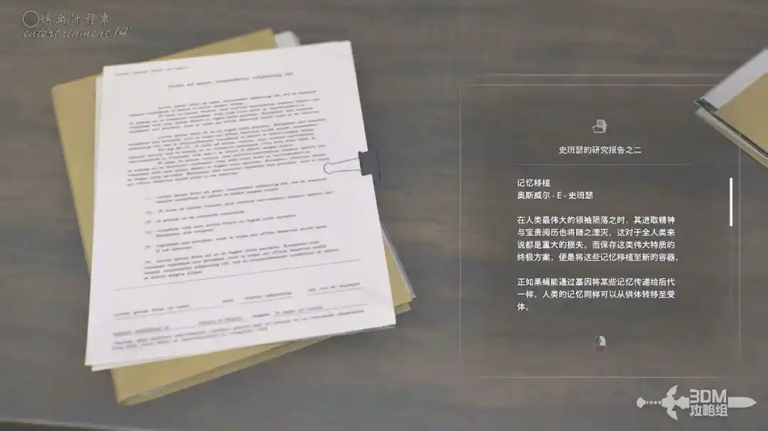 放進去後觸發機關,我們這個房間會降下去。隔壁房間的桌子上有“史班瑟的研究報告之二”。