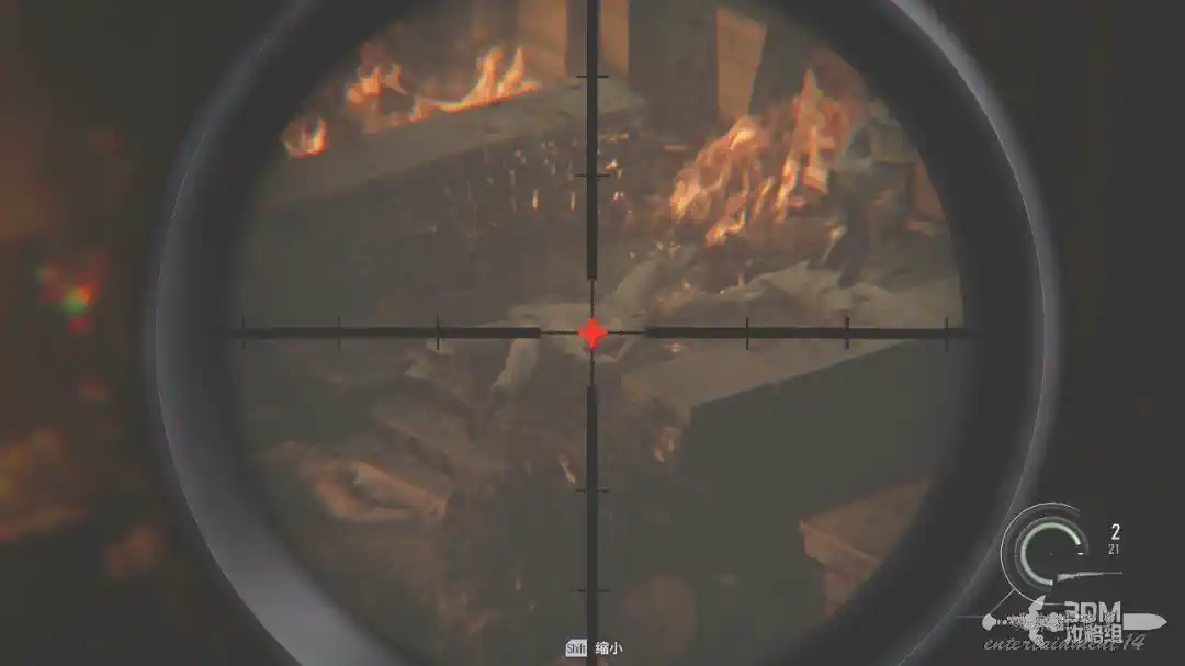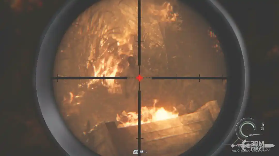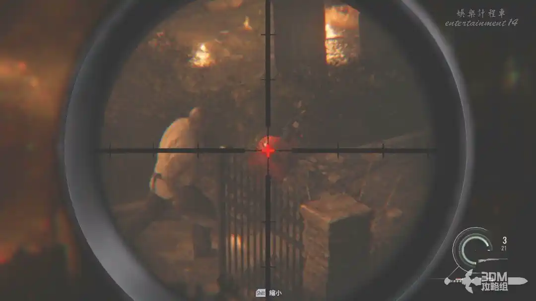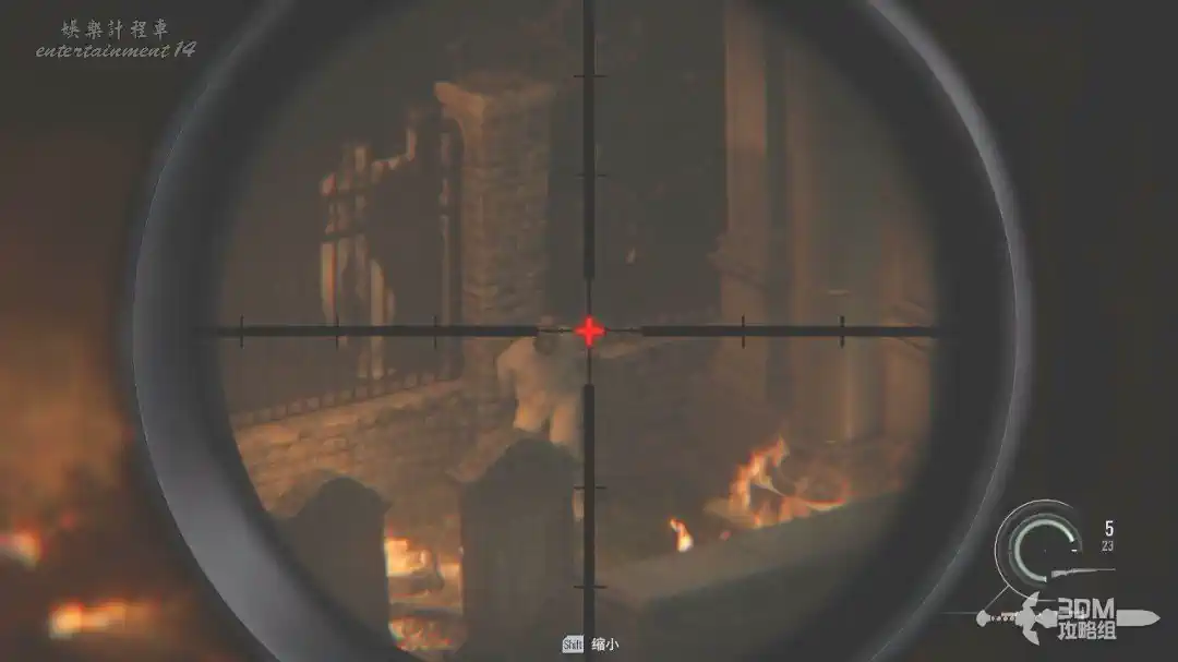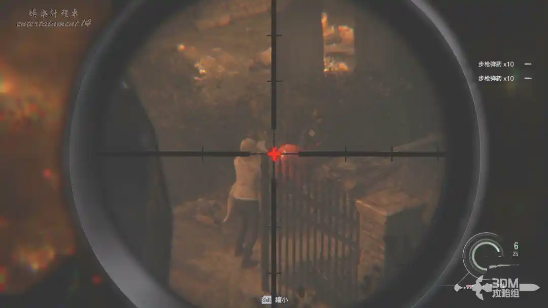 打開狙擊鏡,按SHIFT可以放大,對著鐵門處將這三隻喪屍幹掉(打身體也是一槍死)。