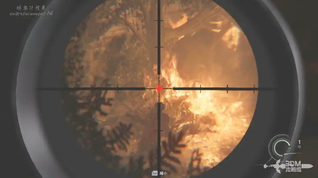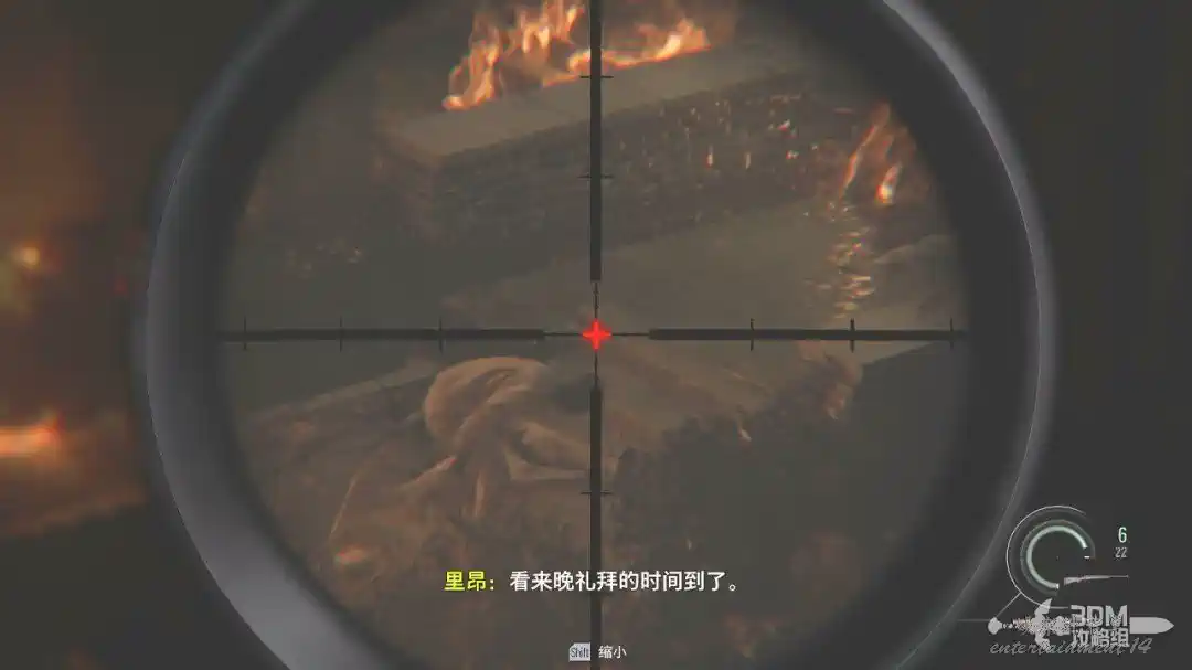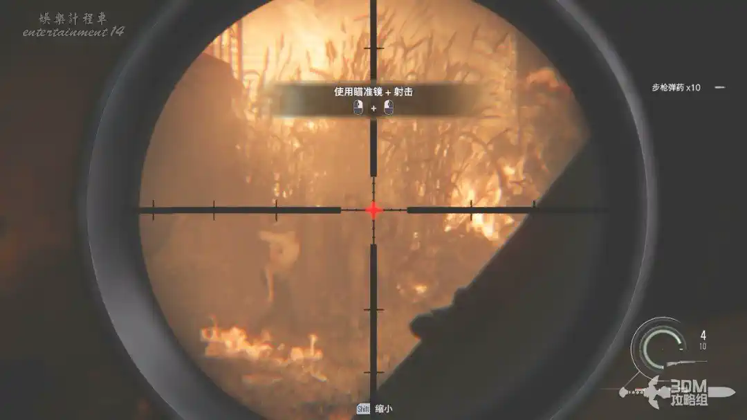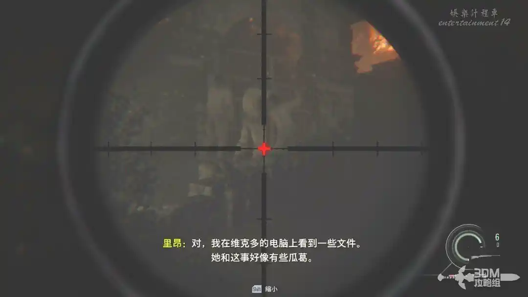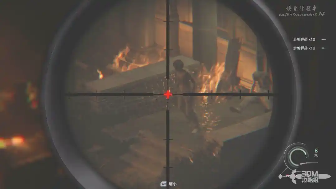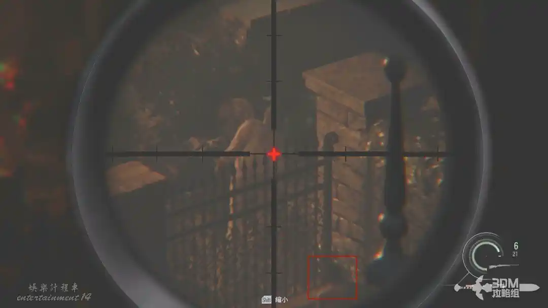 打開狙擊鏡,按SHIFT可以放大,對著鐵門處將這三隻喪屍幹掉(打身體也是一槍死)。