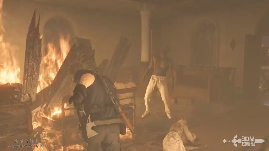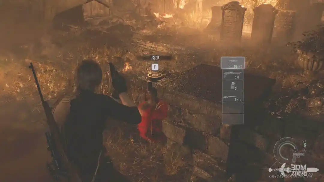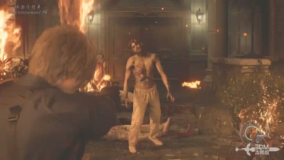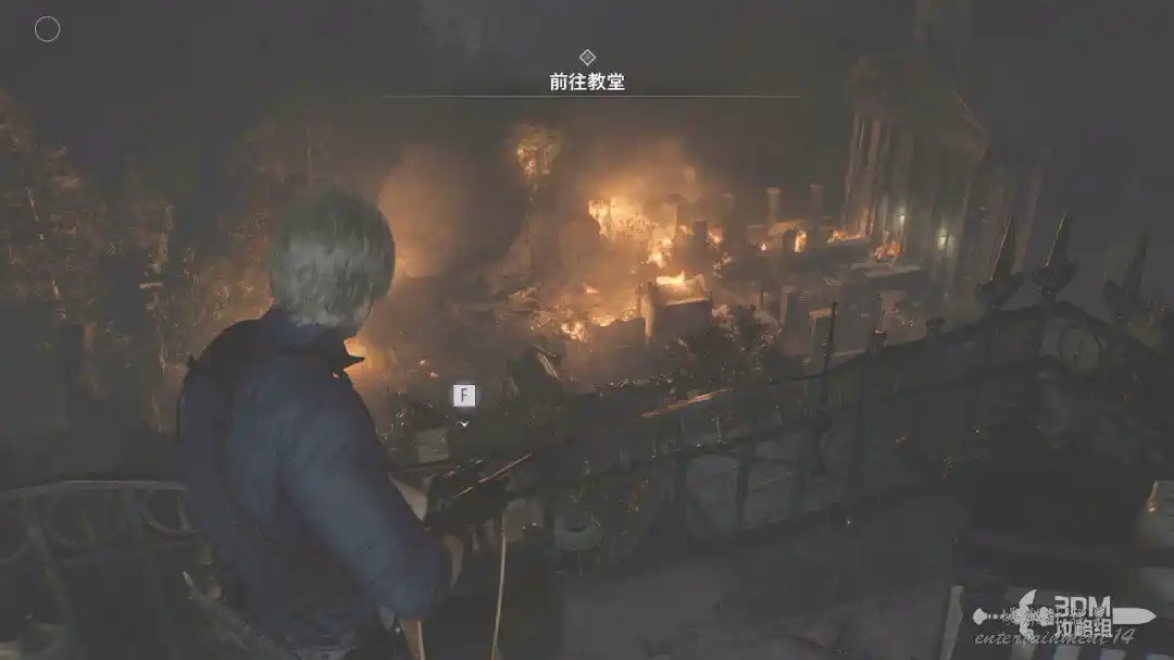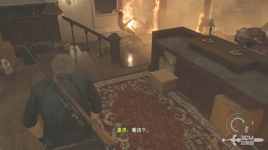 樓下在地上的斧子可以直接按F互動,互動以後里昂會自動丟出去攻擊喪屍,很無腦。