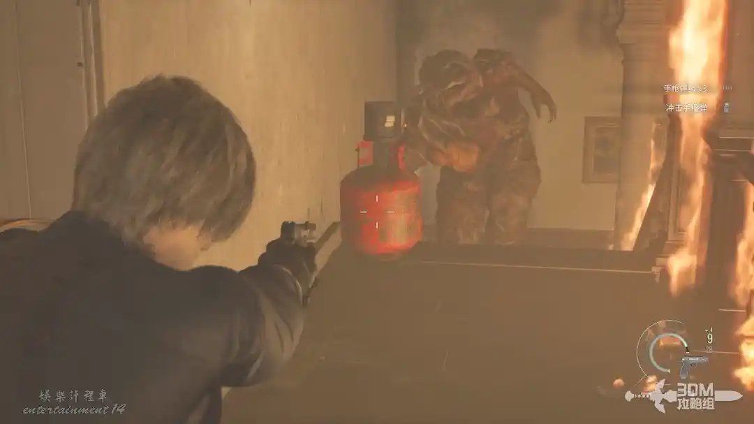 旁邊的樓梯上還有彈藥拿,樓梯口還有個煤氣罐,勾引它過來炸它。
