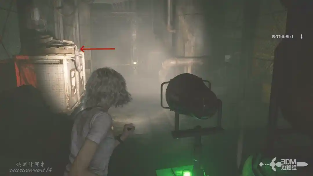 一直往左邊走,左邊角落能發現一個醫療注射器。