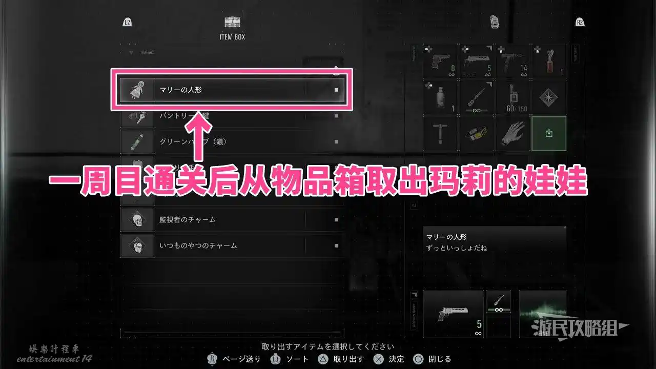 獲得【瑪莉的娃娃】後,將其留在物品箱中並通關完整的主線劇情。通關後讀取在步驟⑥時創建的手動存檔,從物品箱中取出【瑪莉的娃娃】。