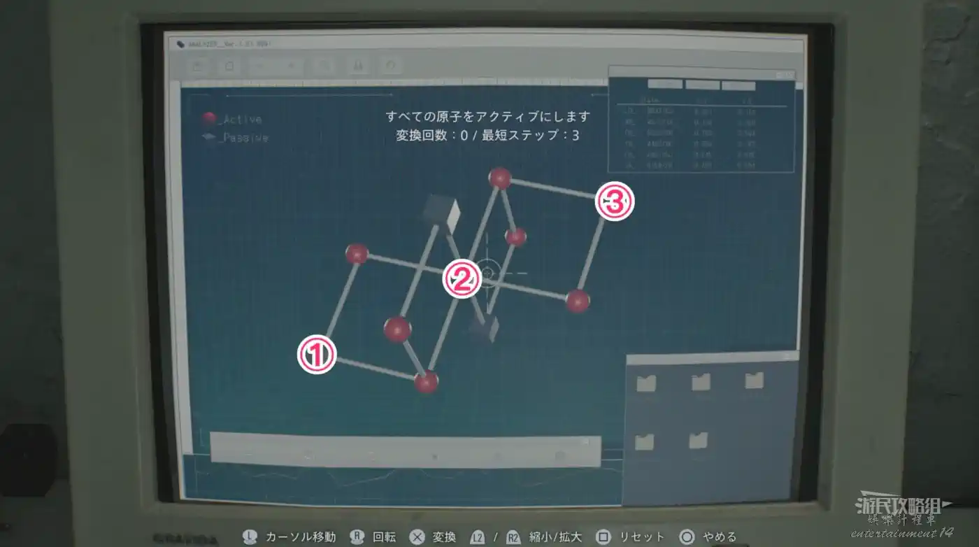 回到【血液研究室】,使用顯微鏡分析【斷手】。分析斷手時的謎題可以參考下圖,按照序號①→②→③的順序依次點擊對應位置原子即可完成解謎。