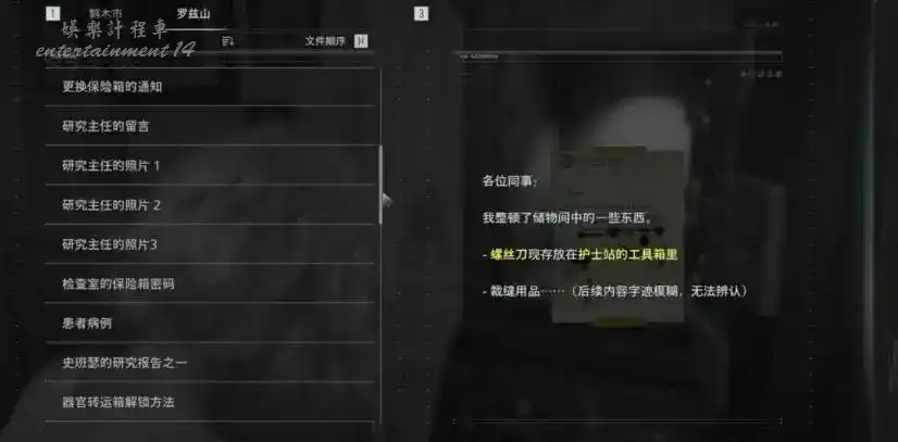 [研討室]前的房間 閱讀☆檢查室的保險箱密碼 再往裡閱讀☆患者病例 拿到金屬溶解劑 再到[研究主任室]觸發劇情