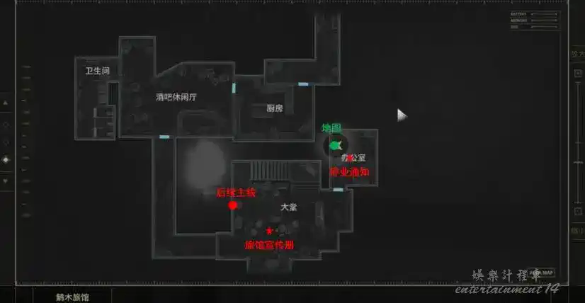 使用鑰匙打開門 一樓[大堂]地上閱讀☆旅館宣傳冊 到[辦公室]的桌櫃裡閱讀☆停業通知 旁邊拿到地圖。