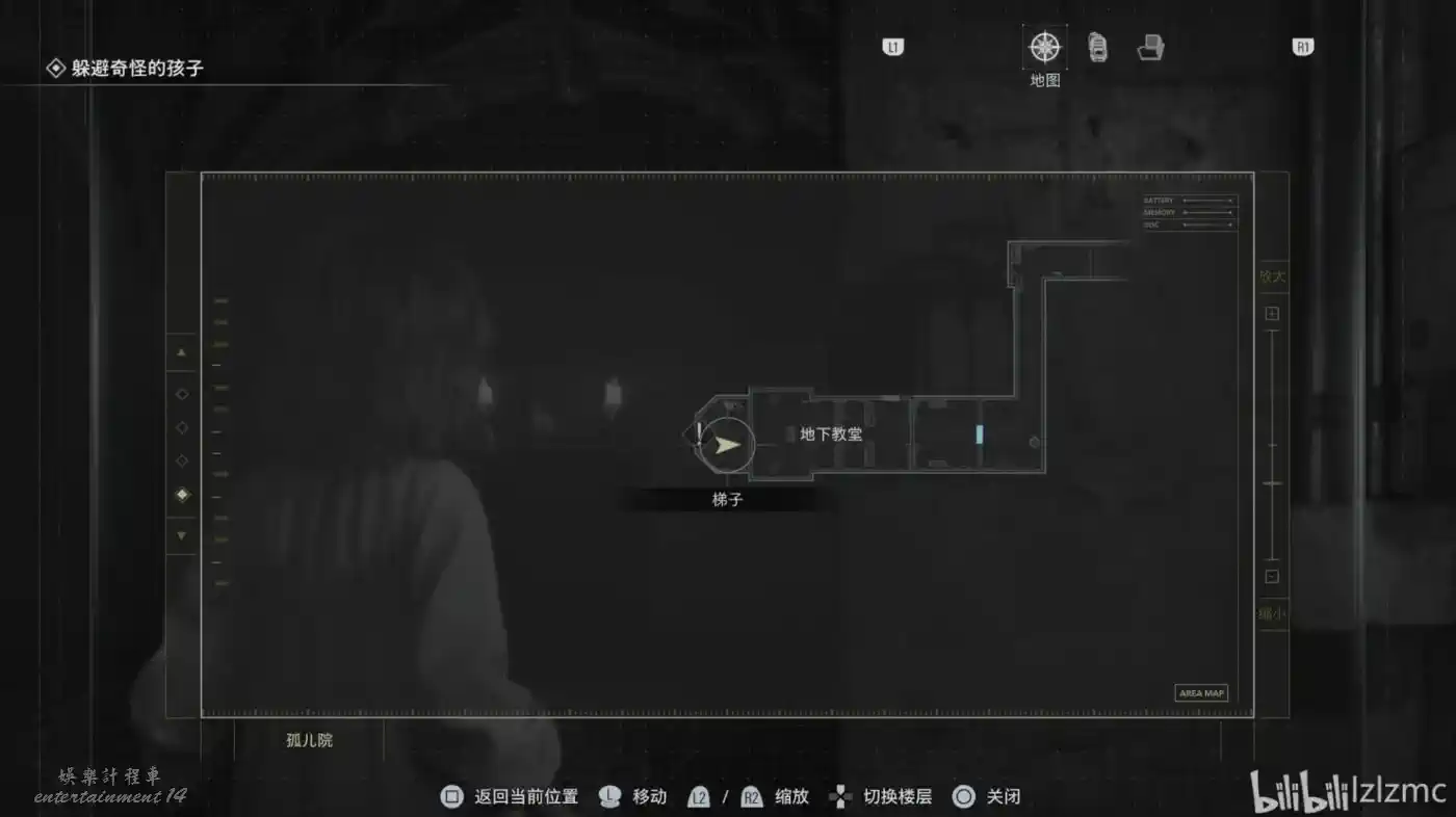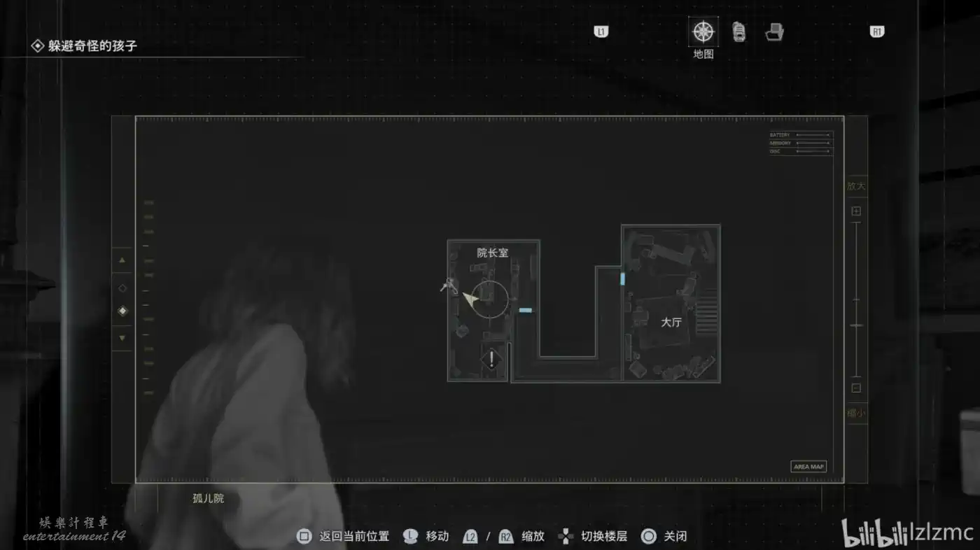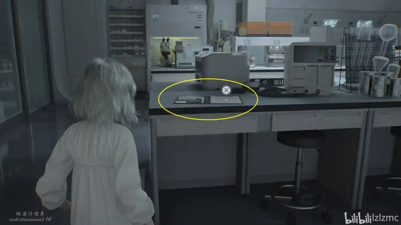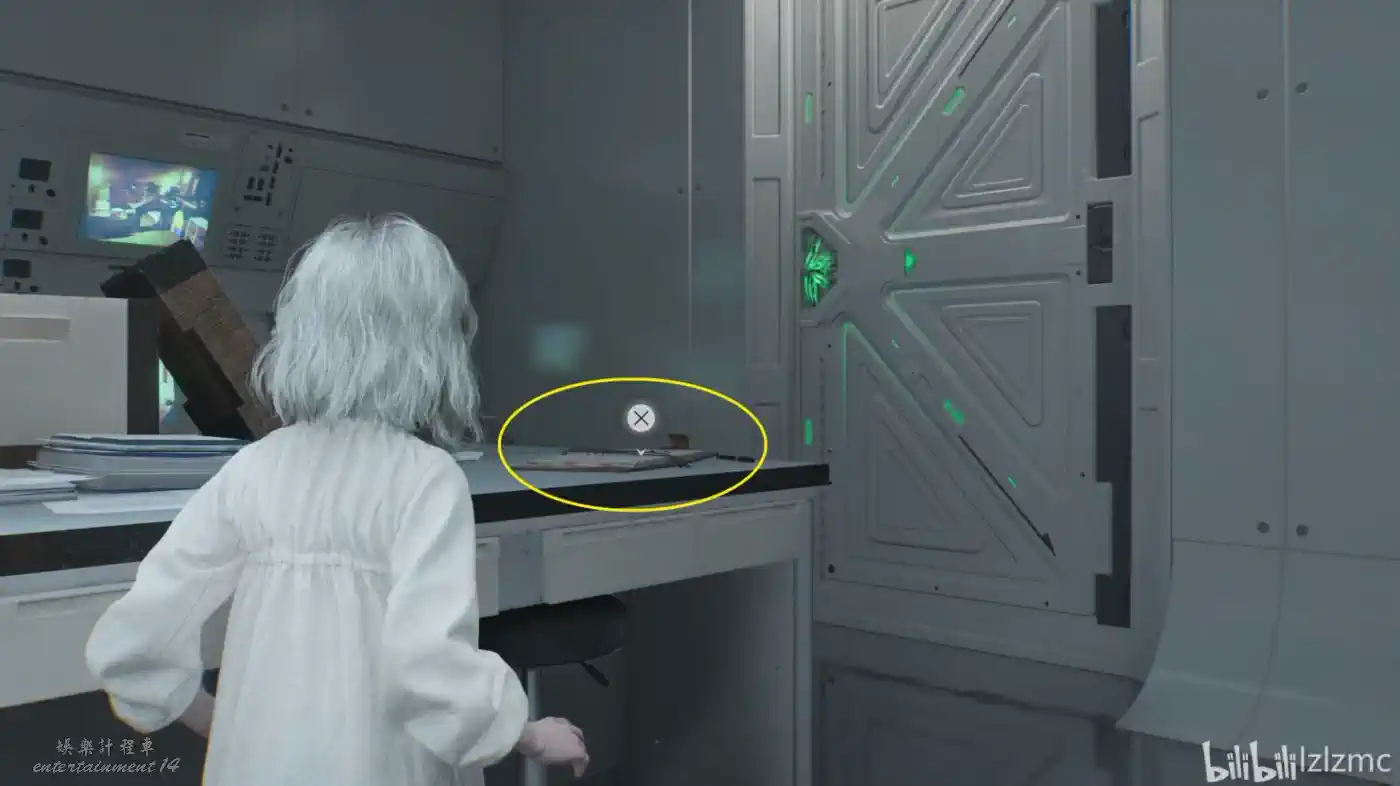 往裡走第二個綠門前的桌子上,調查筆記本獲得【檔64:新任研究員的筆記本】。進入第二、三個綠門,穿過新生兒觀察室到達會議室,調查桌子前方投影儀左邊的遙控器,左搖杆向右切換到最後一個幻燈片劇情。