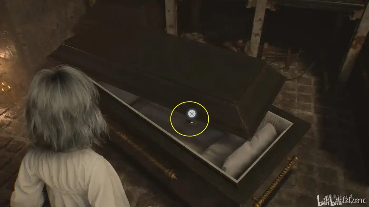 在如圖打開的牆壁處,拉右側的拉杆,打開太平間的門,進入裡面調查棺材,獲得【檔62:遺體管理標籤】。