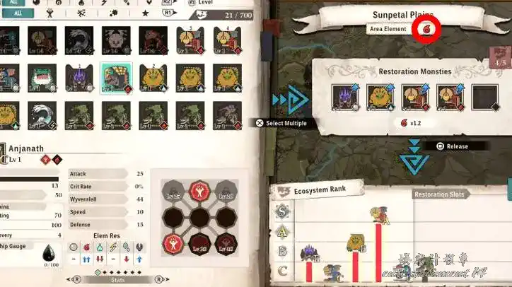 特殊類型的怪物稱為雙元素怪物,通過提升指定怪物在特定區域的生態系統等級獲得。地圖上用紅色圈出,每個區域都分配了一個元素。