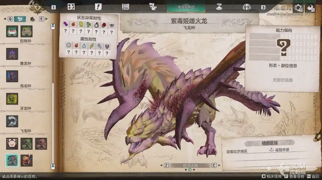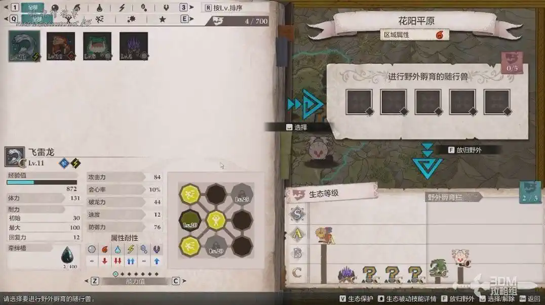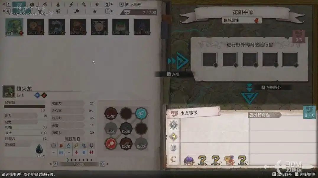 我們先選擇花陽平原,將左側的瀕危怪物“雌火龍”放到右邊放歸野外。