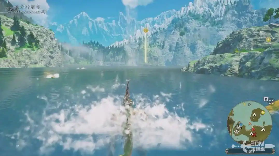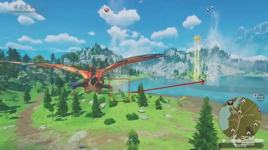 第三個點借助湖邊的氣流飛去對面島上(有游泳技能的怪物可以直接遊過去)。