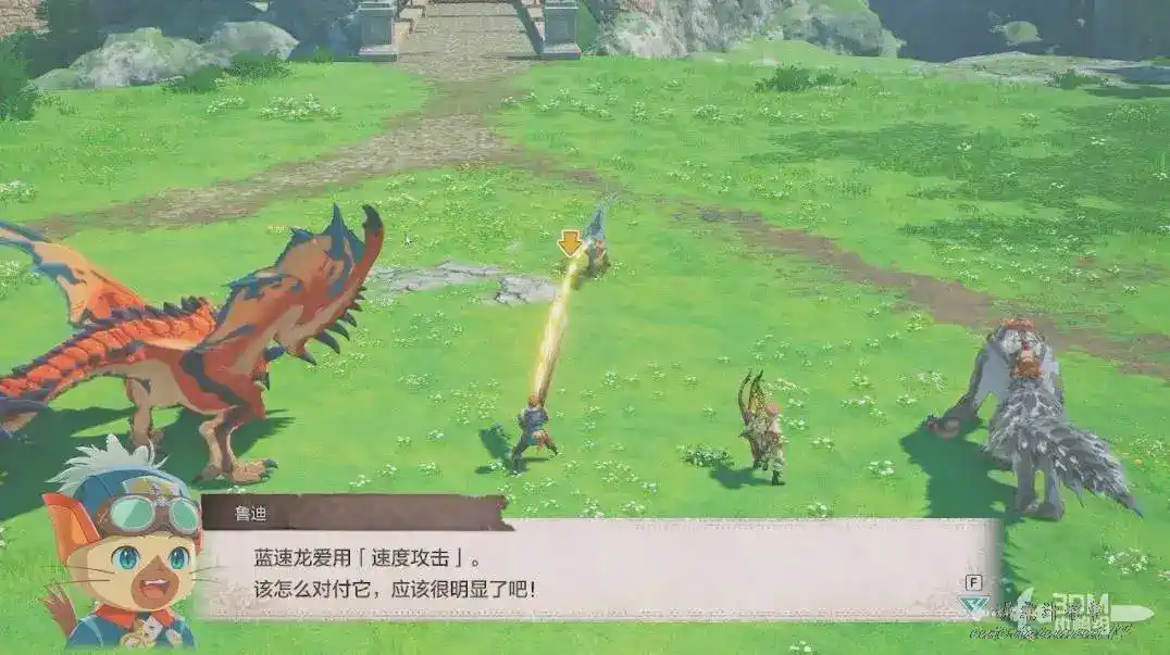 在半路上能碰到藍速龍,我們可以從背後偷襲打奇襲。接下來會進入第一場戰鬥,是簡單的教學關卡。