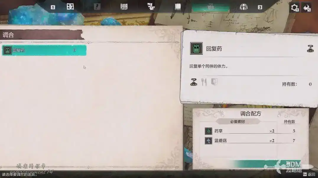 採集完後我們按TAB鍵可以打開功能表,找到右邊的“調和”製作恢復藥。