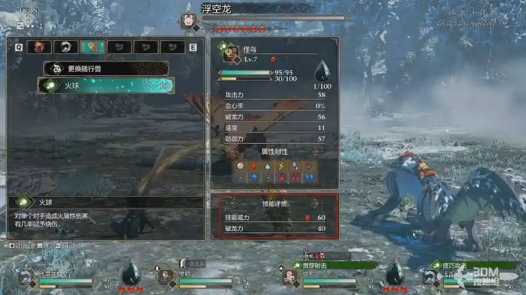 比如我們先使用這個“火球”,右邊的面板上能看到是火屬性的。下面的破龍力越高,越能快速將敵人打破防。