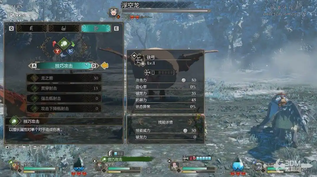 人物的技能和攜帶的武器有關,一個人物能帶三把武器(筆者感覺太刀很猛)。在武器上裝飾品也可以增加可用技能。