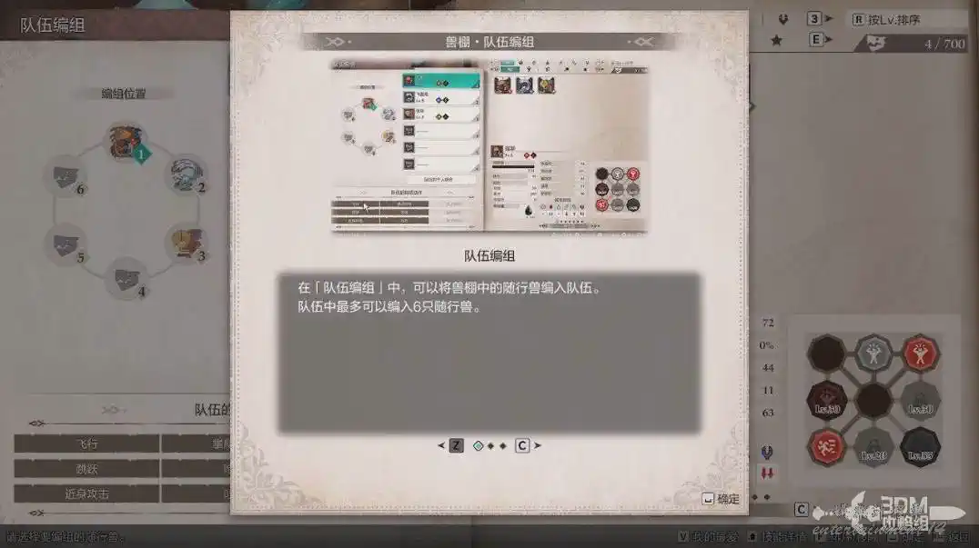 獸棚處可以隊伍編組,一個隊伍裡最多能帶6只隨行獸。