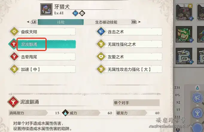 泥翁龍的核心技能泥波翻湧,是本次挑戰的關鍵,可以通過技能遺傳,把這個實用技能傳承。