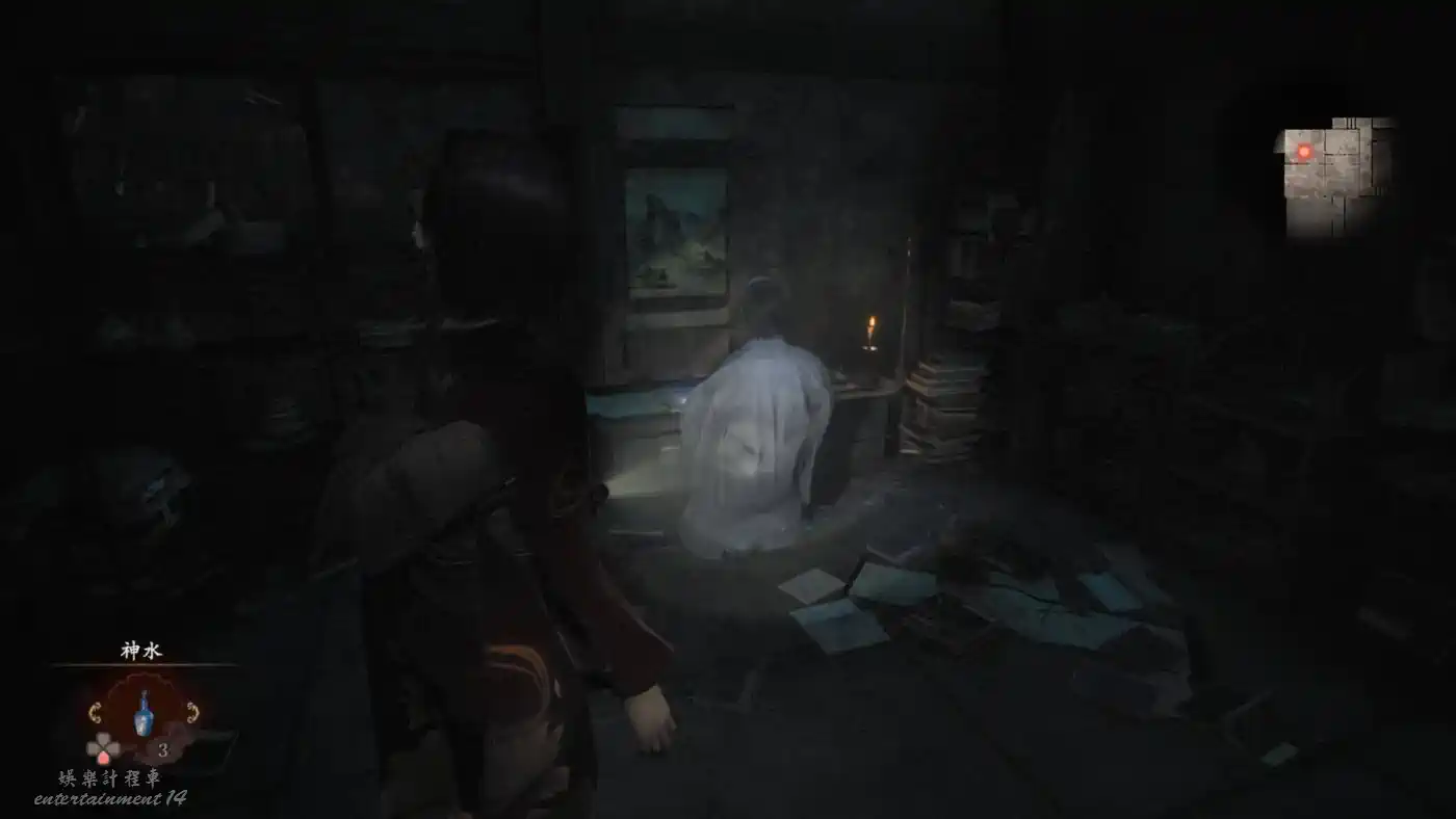 在完成第四章後,前往逢阪家二樓的書齋,可以看到男人的浮靈,並且撿到【民俗學家的筆記 五】