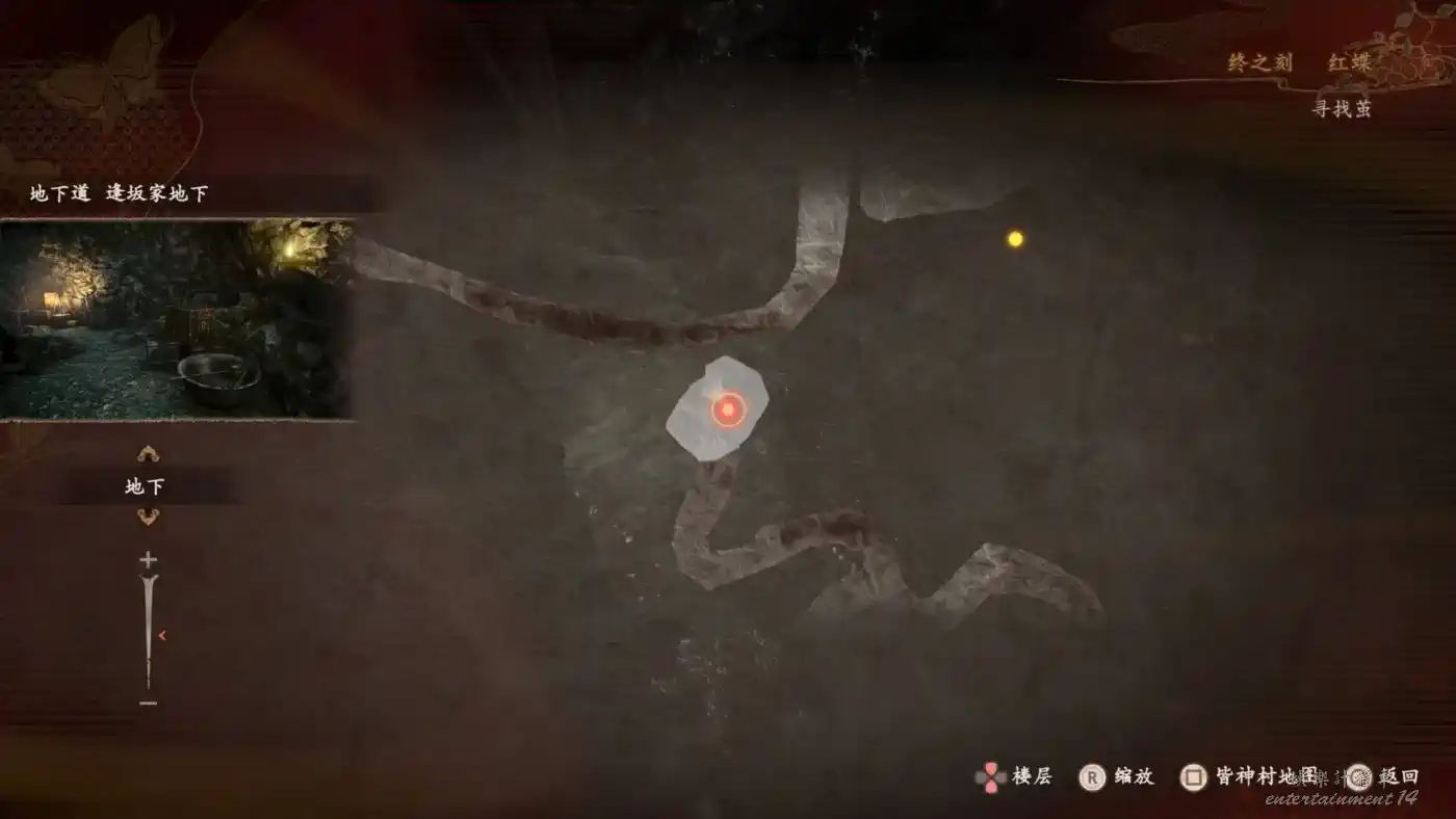 從逢阪家進入地下(不能帶繭,必須在單人時才可前往),在需要蹲下前行處進入一處洞穴,在一個紅箱子上可以拍到調查地下道的男人,並撿到【民俗學家的筆記十一】
