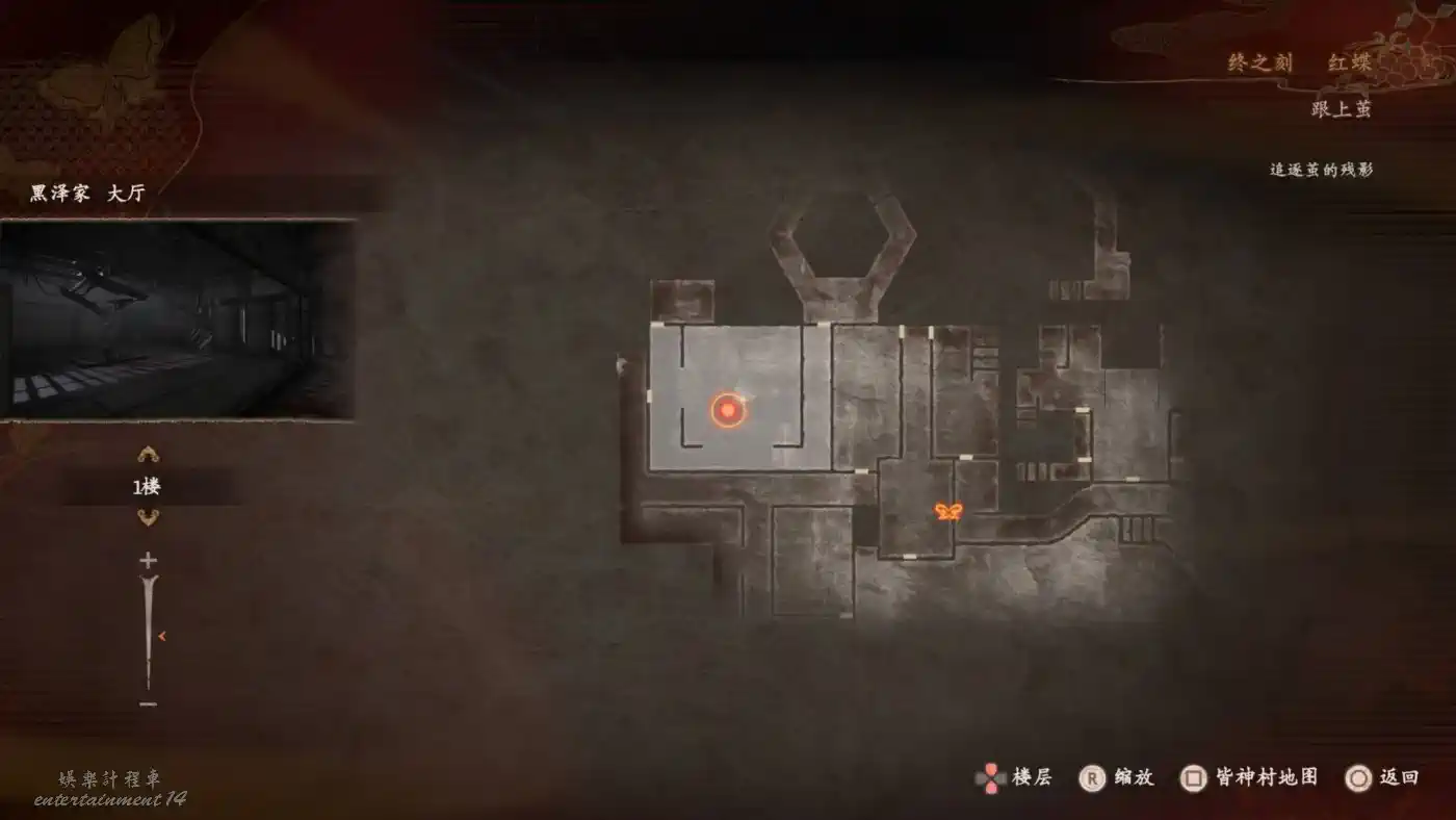 集齊四份文件後,前往【黑澤家大廳】,在西北側有一個可以拍照打開的密道,裡面可以拍照看見精疲力盡的男人,並撿到【沾有血跡的紙條】、【沾有血漬的戒指】