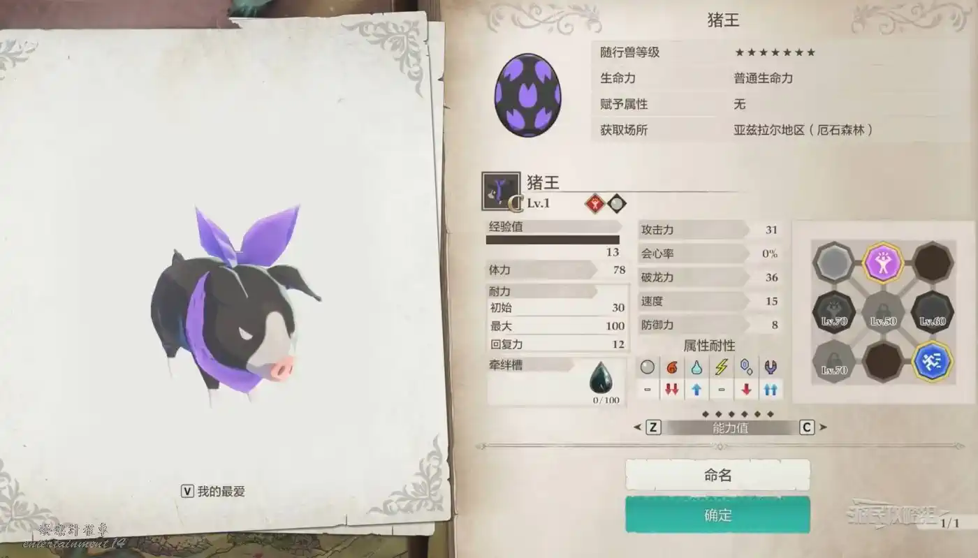 收集100只噗吱豬,並完成【捕獲噗吱豬·其四】後,亞茲拉爾區域的地圖北邊會出現【???的巢穴】,前往巢穴中獲得豬王的蛋,豬王可以通過消耗自身HP和耐力來造成巨大傷害(獨特固有技能),非常推薦入隊使用。