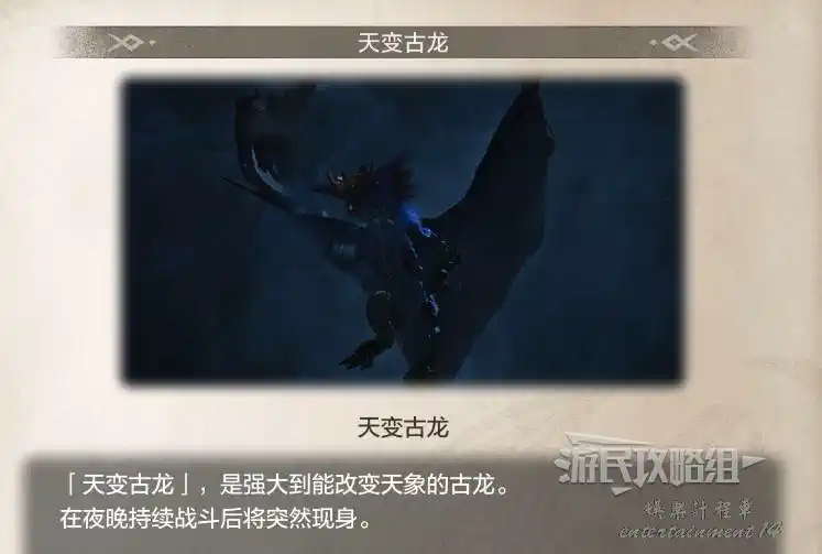 天變古龍在夜晚持續戰鬥後,會觸發過場動畫並在原野上出現。持續戰鬥所挑選的目標不論大型小型,只要保持持續戰鬥就能讓天變古龍現身,因此建議優先考慮容易擊敗的小型怪物。