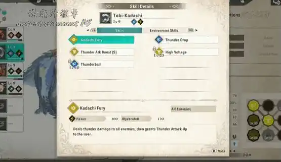 例:扉劍(雷狼龍)的刀立狂怒:造成雷鳴傷害,同時給騎士加雷屬性攻擊提升。