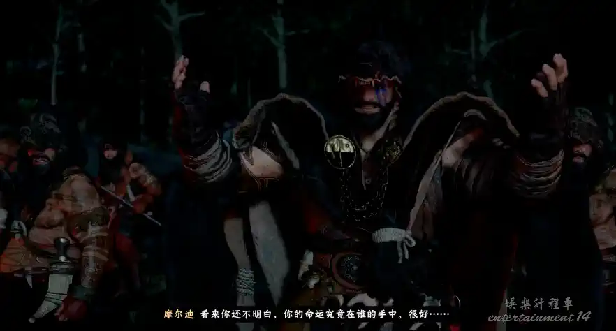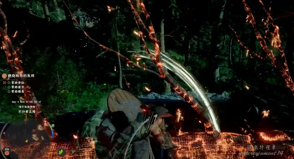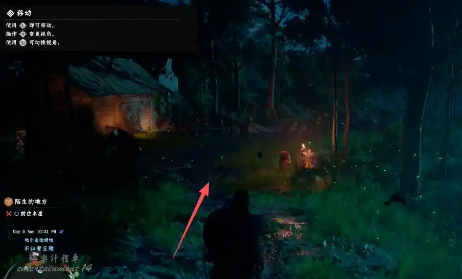 故事啟幕,主角現身於一片幽暗森林。循著火光向下穿行,抵達一座木屋近旁。