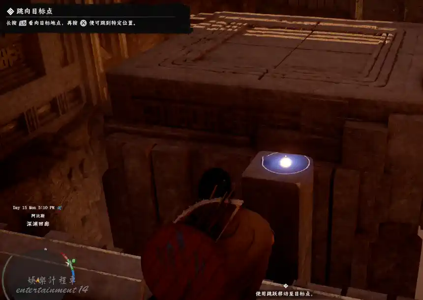 沿正面前行,跨過數級石階。按指引使用“注視”技能,地面將浮現一枚藍色光點。