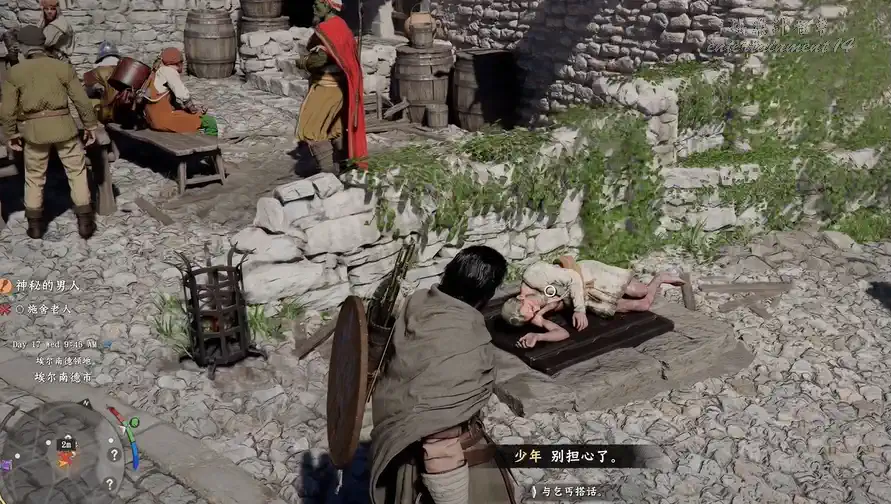 步出酒館,與右側橫臥於下水道口的男子對話,他將贈予一把“斑駁的古舊鑰匙”。