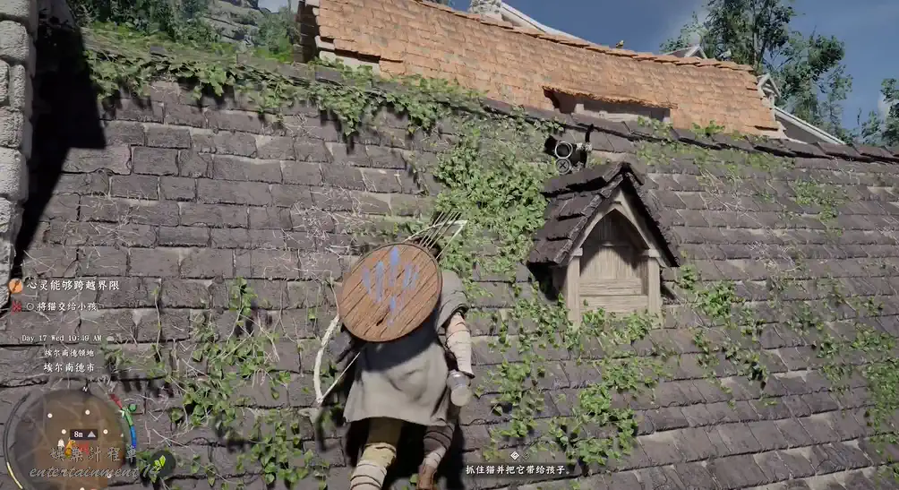 屋前有一綠衣孩童,與之對話後,攀上鄰近的藍色屋頂,與棲身其上的黑貓互動即可。