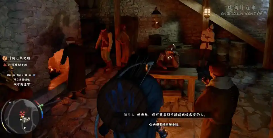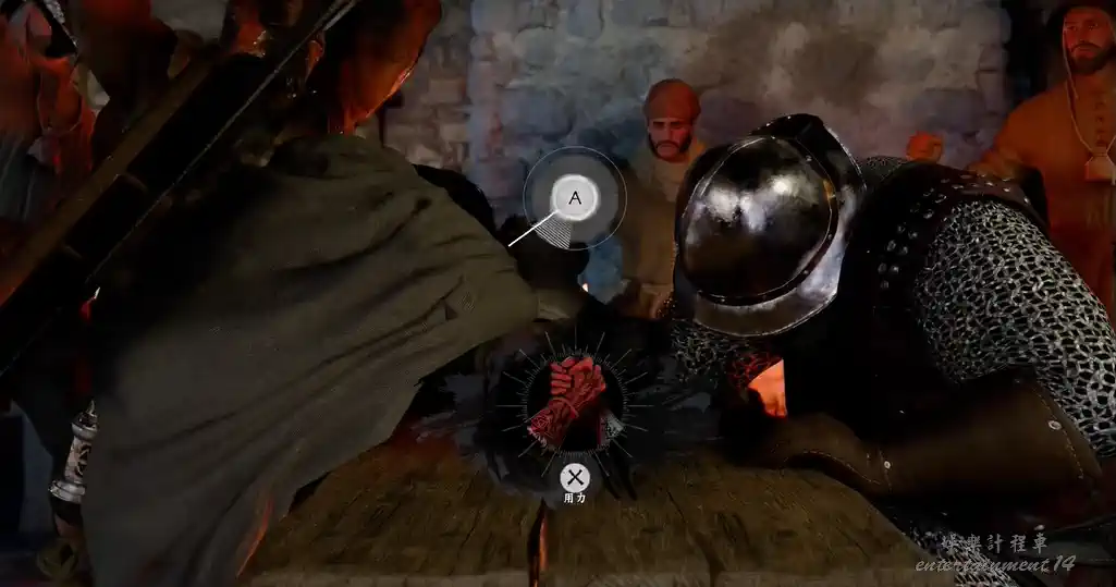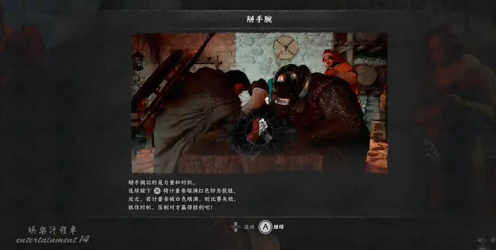 與中央端坐的紅鎧男子交談,觸發扳手腕小遊戲。取勝即可完成此項挑戰。