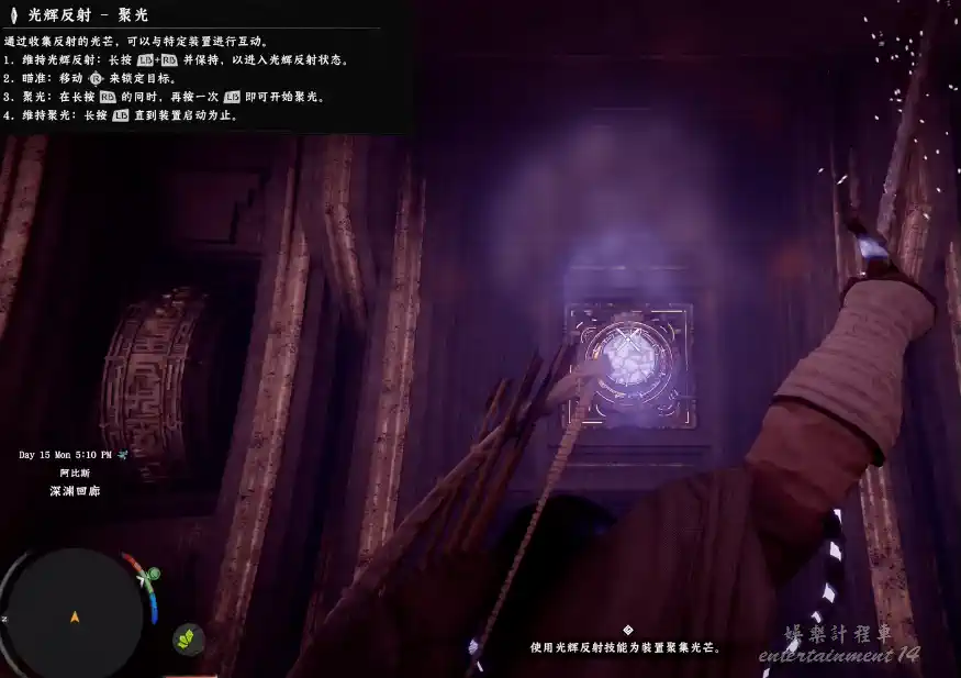 依循指引使用組合技舉劍,以劍身折射光線。當前方光球轉為藍色時,保持靜止,大門便會緩緩開啟。