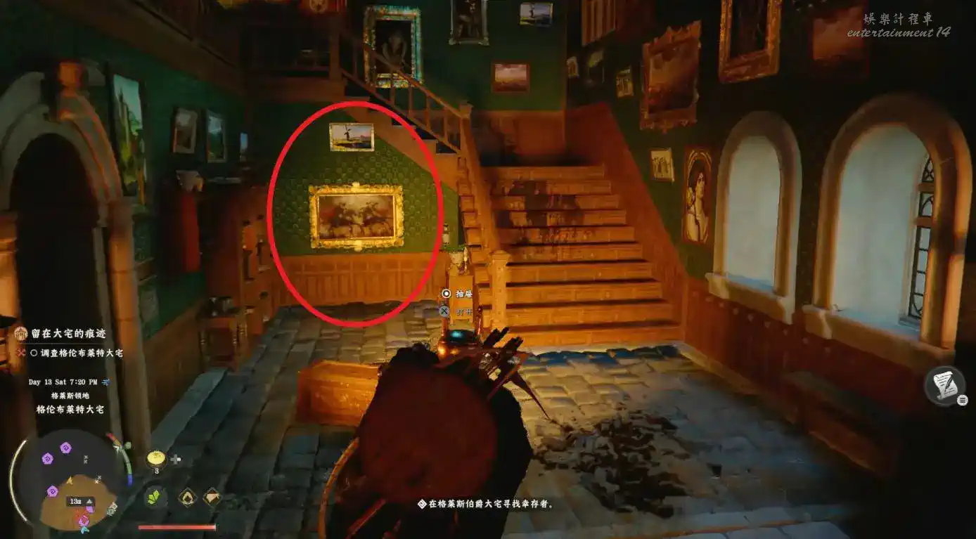 大廳往右看,樓梯旁有幅畫掛在盡頭,這是一個隱藏牆壁,貼牆進去可拿鑰匙“格萊斯大宅的地下室鑰匙”。
