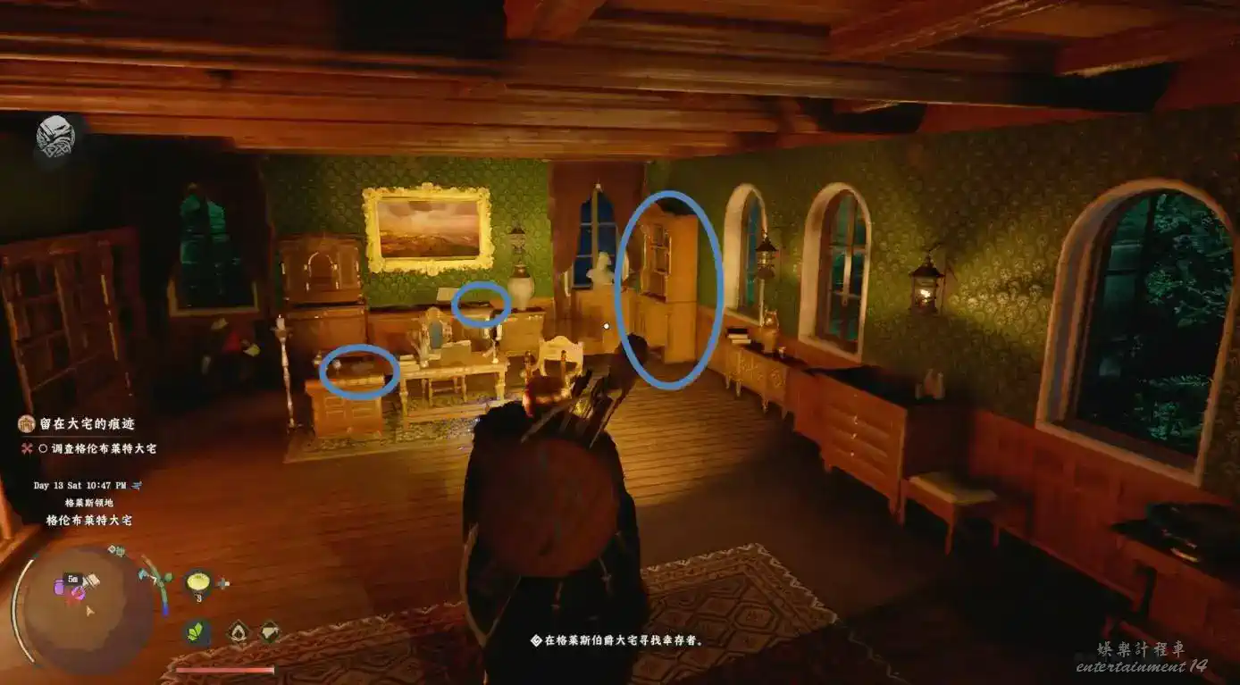 對面書桌左邊拿“格萊斯大宅的鐵門鑰匙”,中間藍圈拿“格萊斯伯爵的日誌”,右側書架拿“世界雙手武器全集·第1卷”。