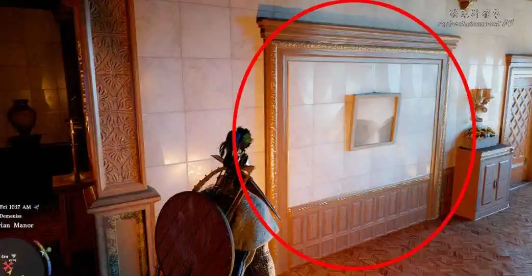 在頂層走廊中,有一面外觀和周圍牆面明顯不同的牆(視覺上有紋理 / 圖案差異)。