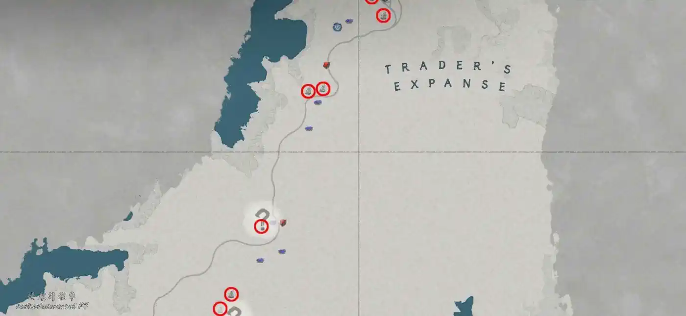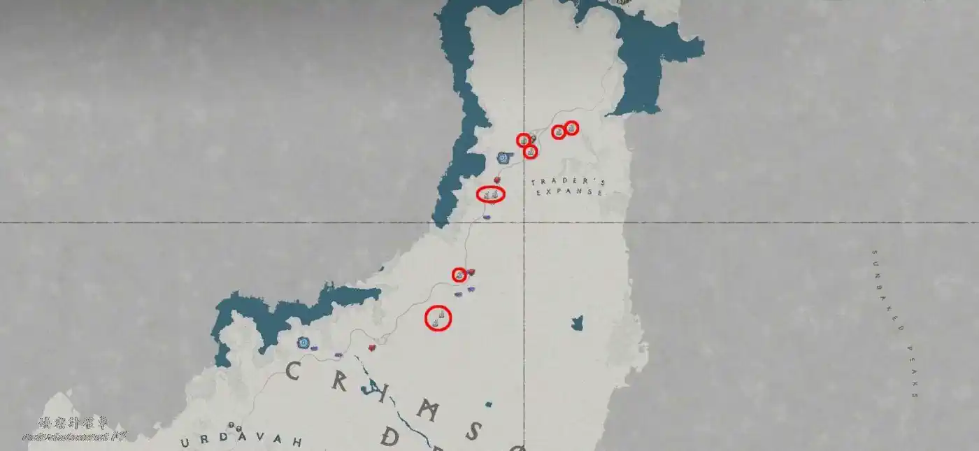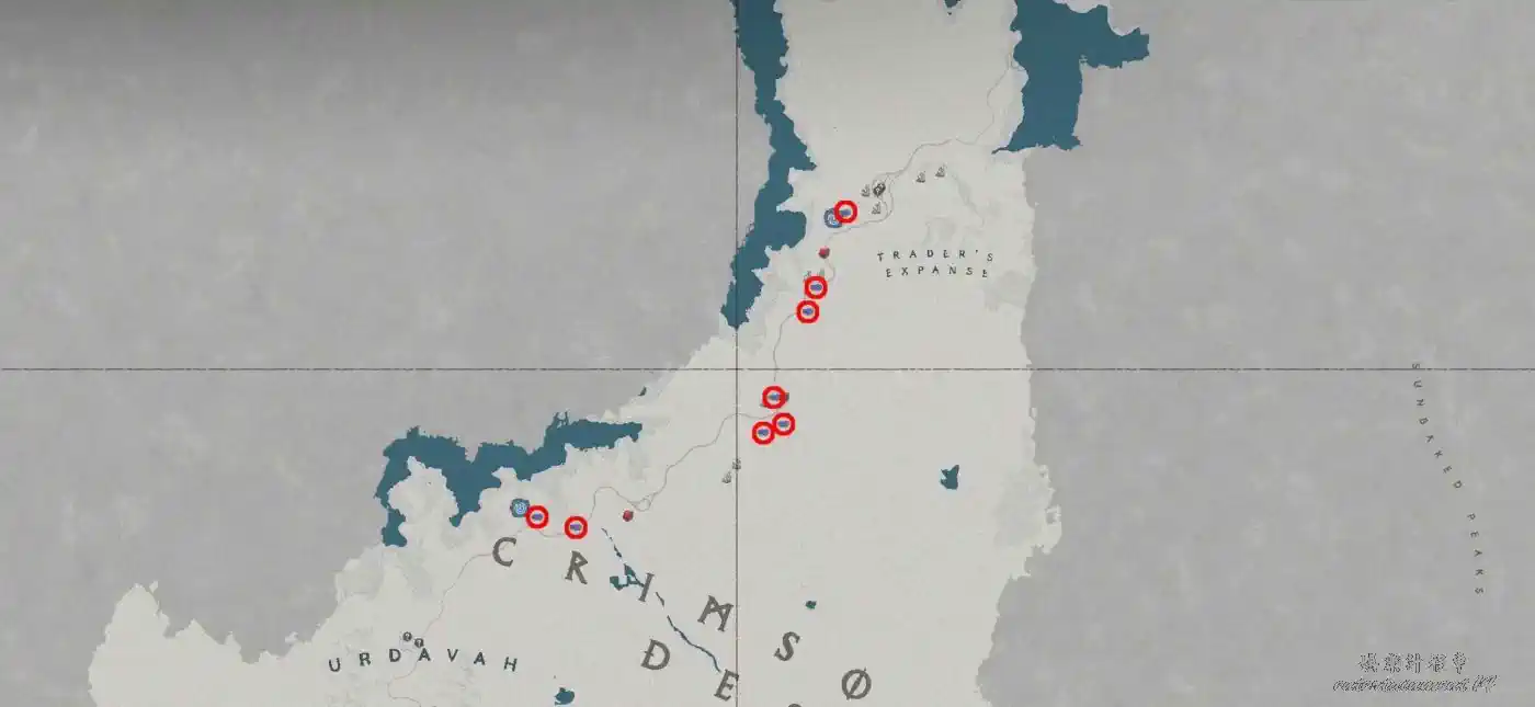 位於紅色沙漠通往瓦尼亞的主幹道兩側,具體位置可參考遊戲內地圖或截圖標記。