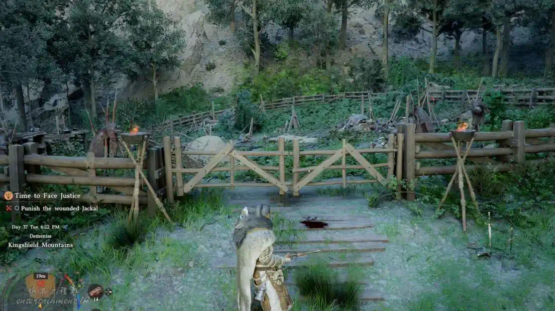 進入圍欄,用追蹤視角對準地面血跡(中心位置)