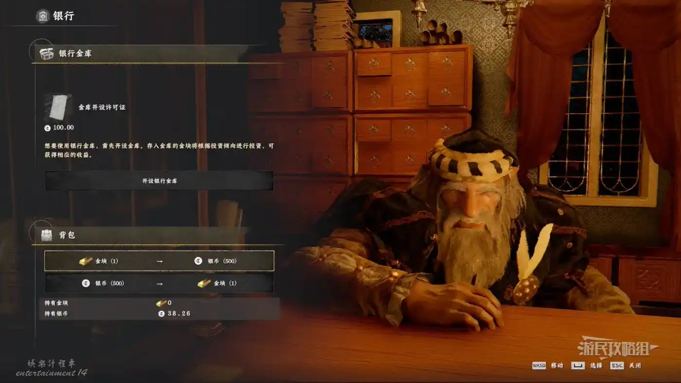 ④可通過在銀行投資金塊來獲得投資收益。埃爾南德鎮北部就有銀行,在地圖上以“?”圖示標記(切換到環境選項卡)。500銀幣可以兌換成1個金塊,並且可以花費100銀幣購買一個保險箱。之後就可以投資金塊來自動獲取收入。不過由於一個金塊的價格比較昂貴,在前中期不太能買得起。建議在有充裕的資金時再進行投資,與其讓資金閒置在背包中,不如投資銀行賺利息。另外,金塊也可以換回500銀幣。