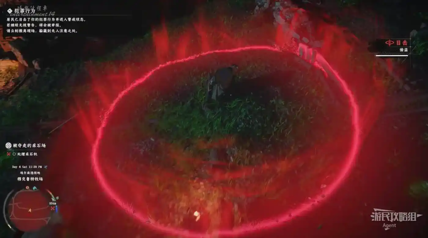 發生犯罪行為後,現場將生成搜查區域。在被舉報前得儘快脫離該區域並避開居民視線。(只需迅速跑到紅圈之外就安全了)